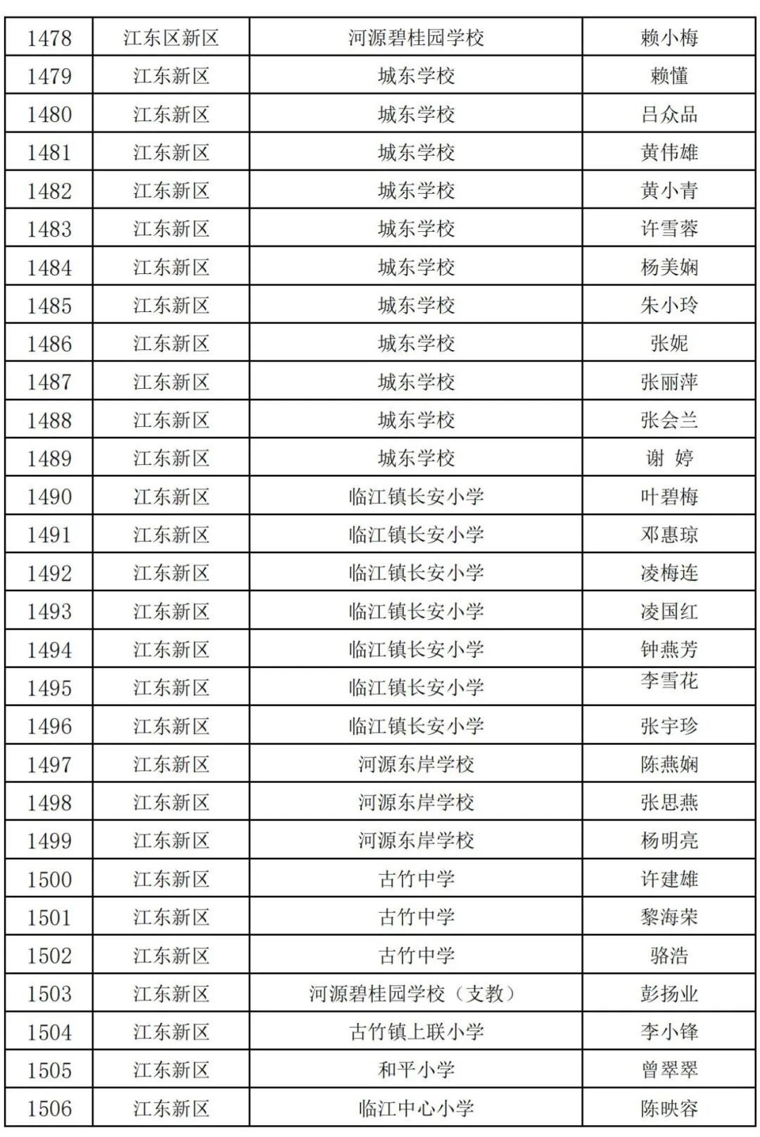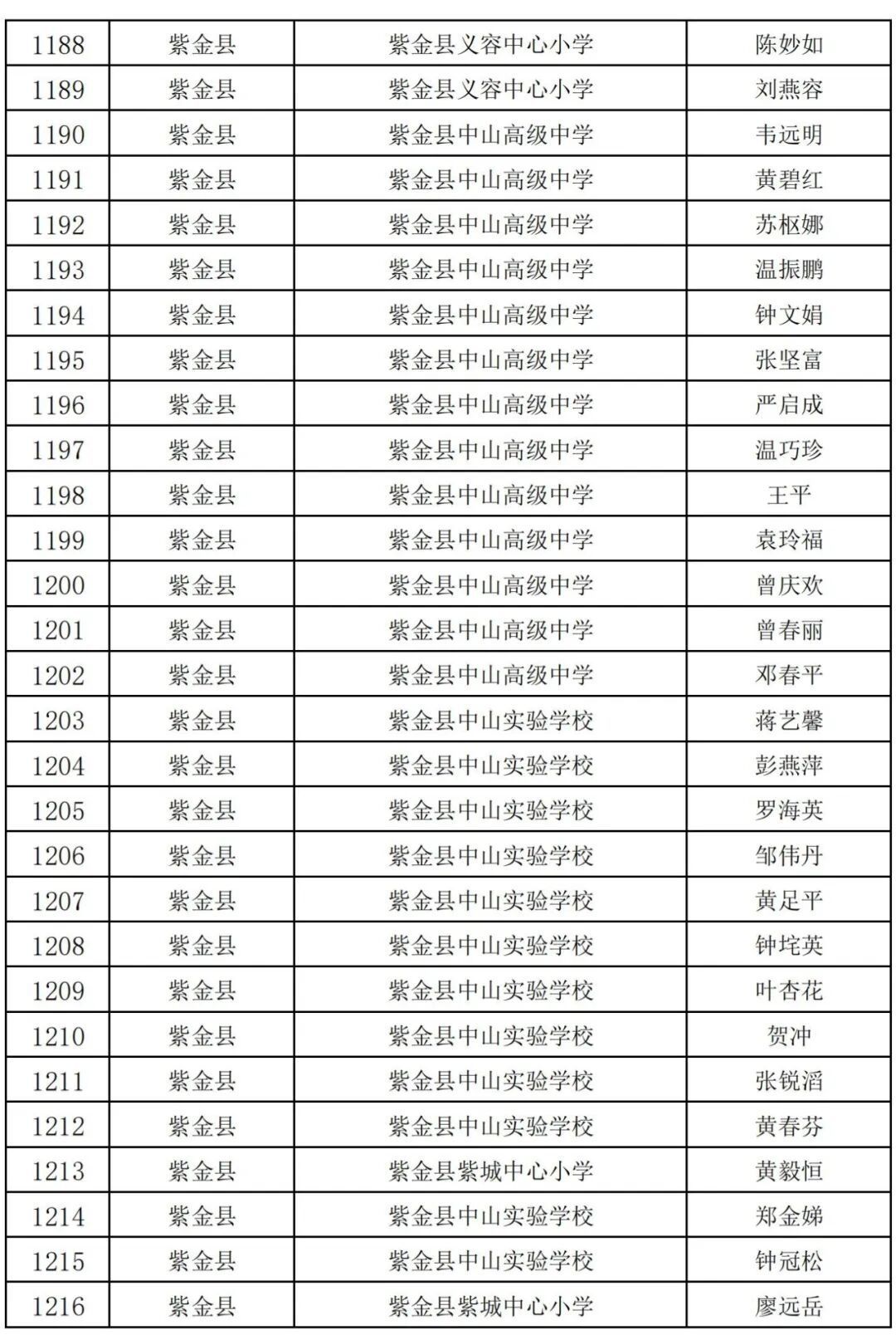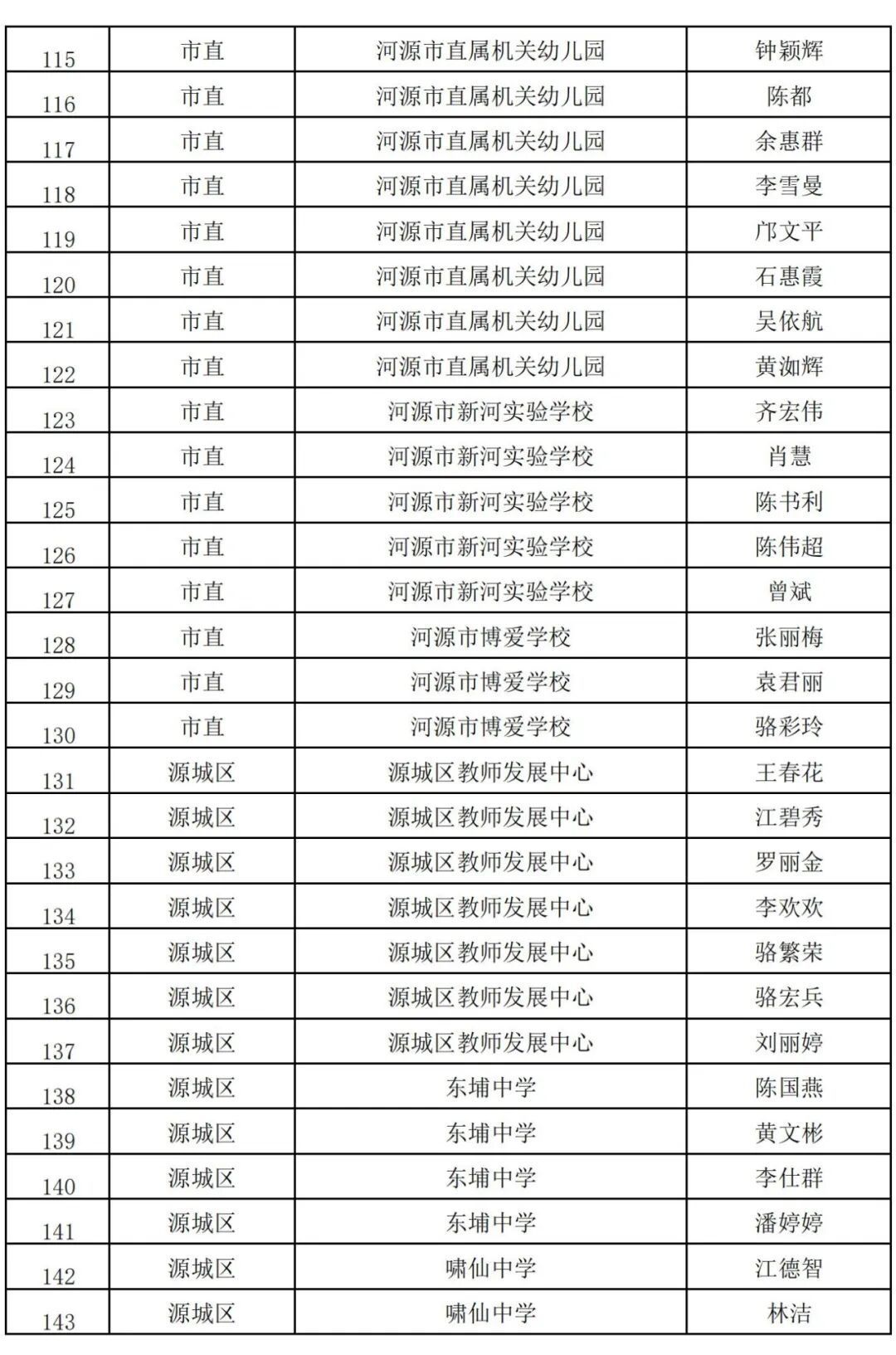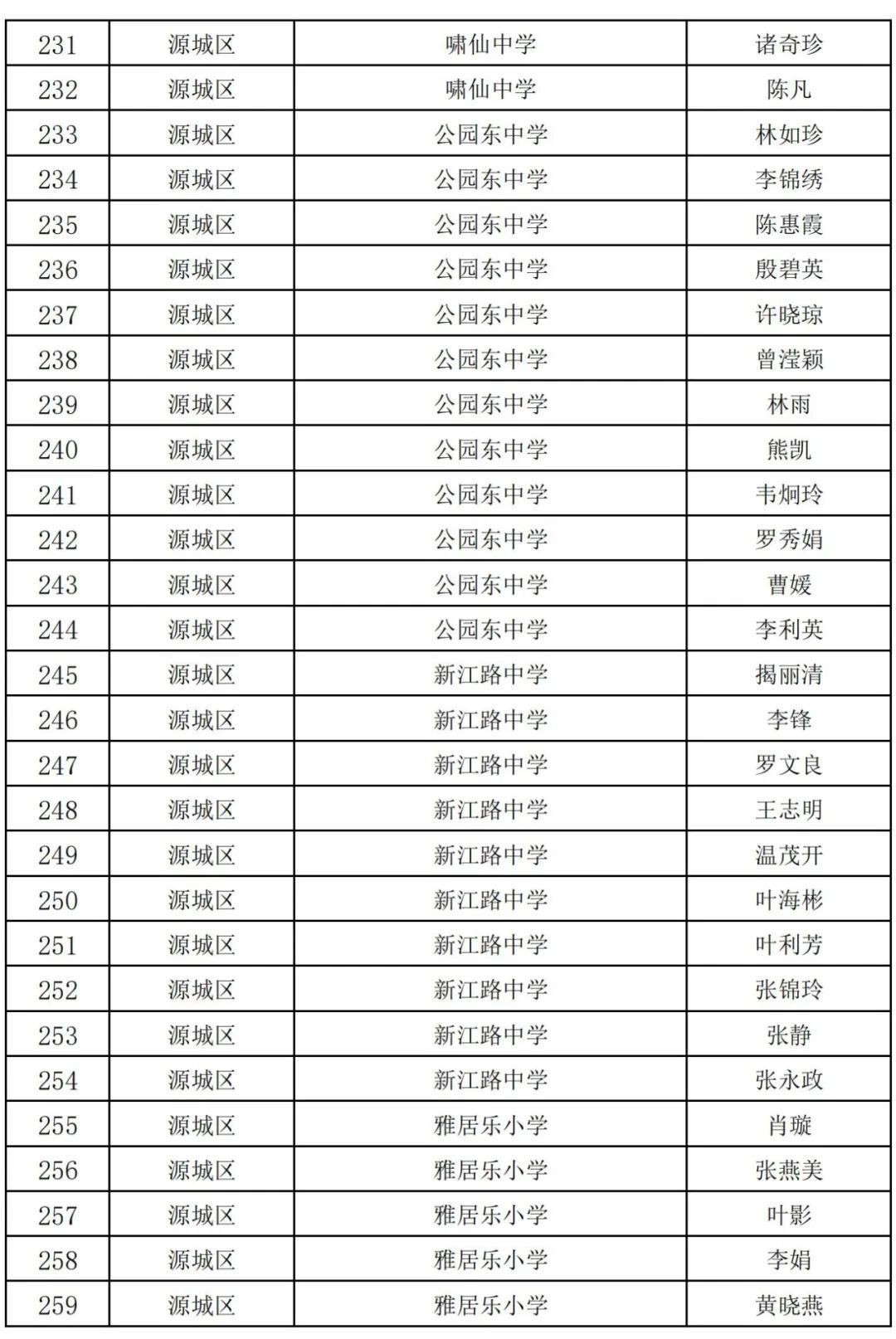 根据《河源市高素质教师队伍建设项目实施方案》《河源市教育局关于开展河源市中小学市级卓越教师、骨干教师(第二批)遴选认定的通知》(河教师〔2025〕23号),在各地各校推荐的基础上,经评审小组审核和遴选等环节,拟认定陈水燕等358人为市卓越教师,蔡健芳等1509人为市骨干教师,现予以公示(详见附件)。
