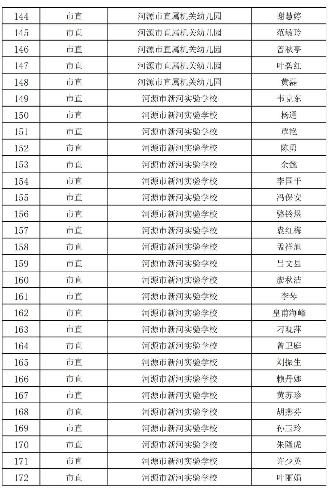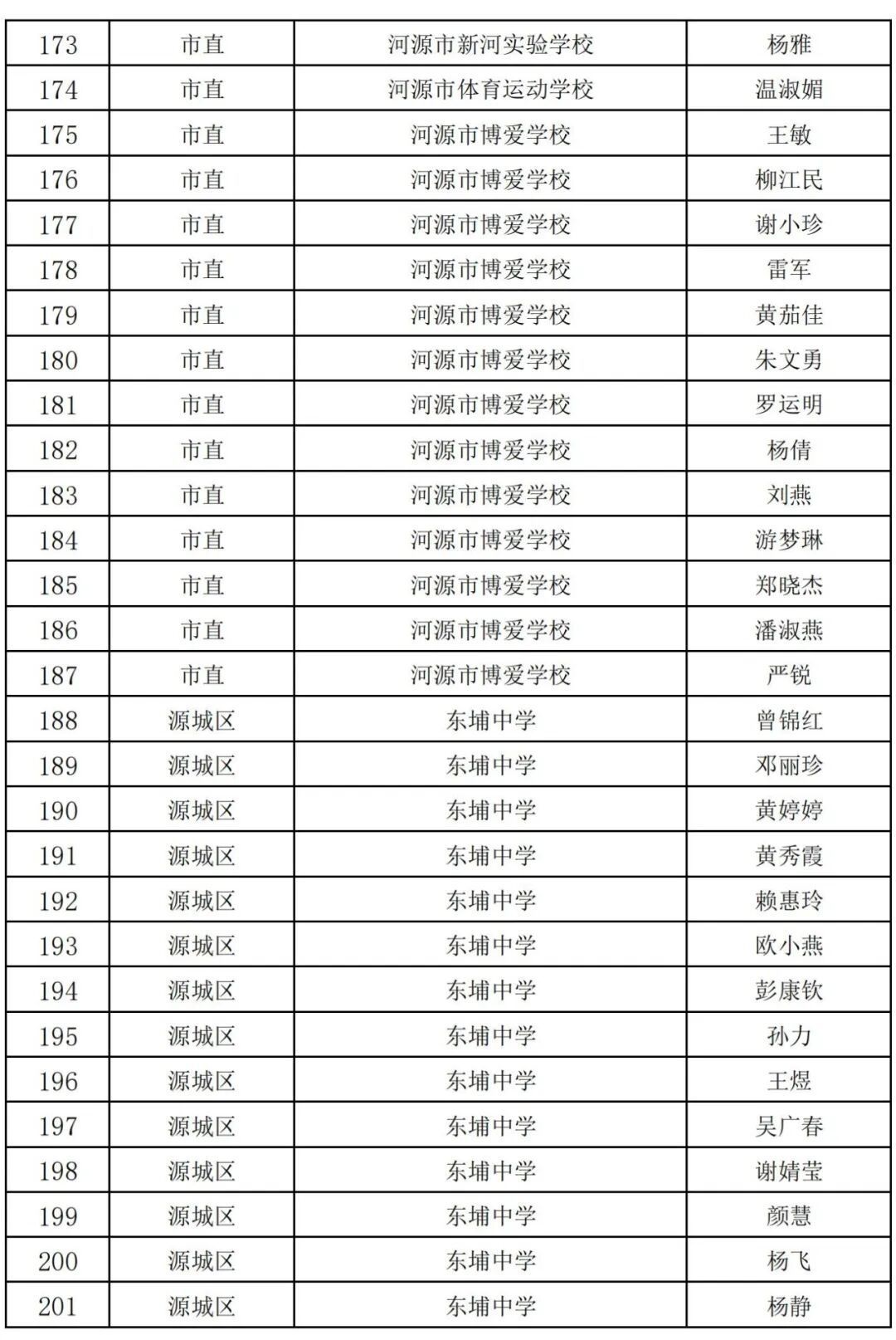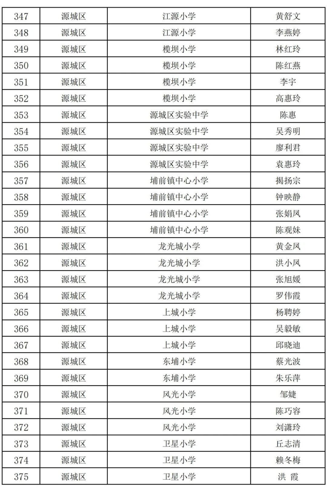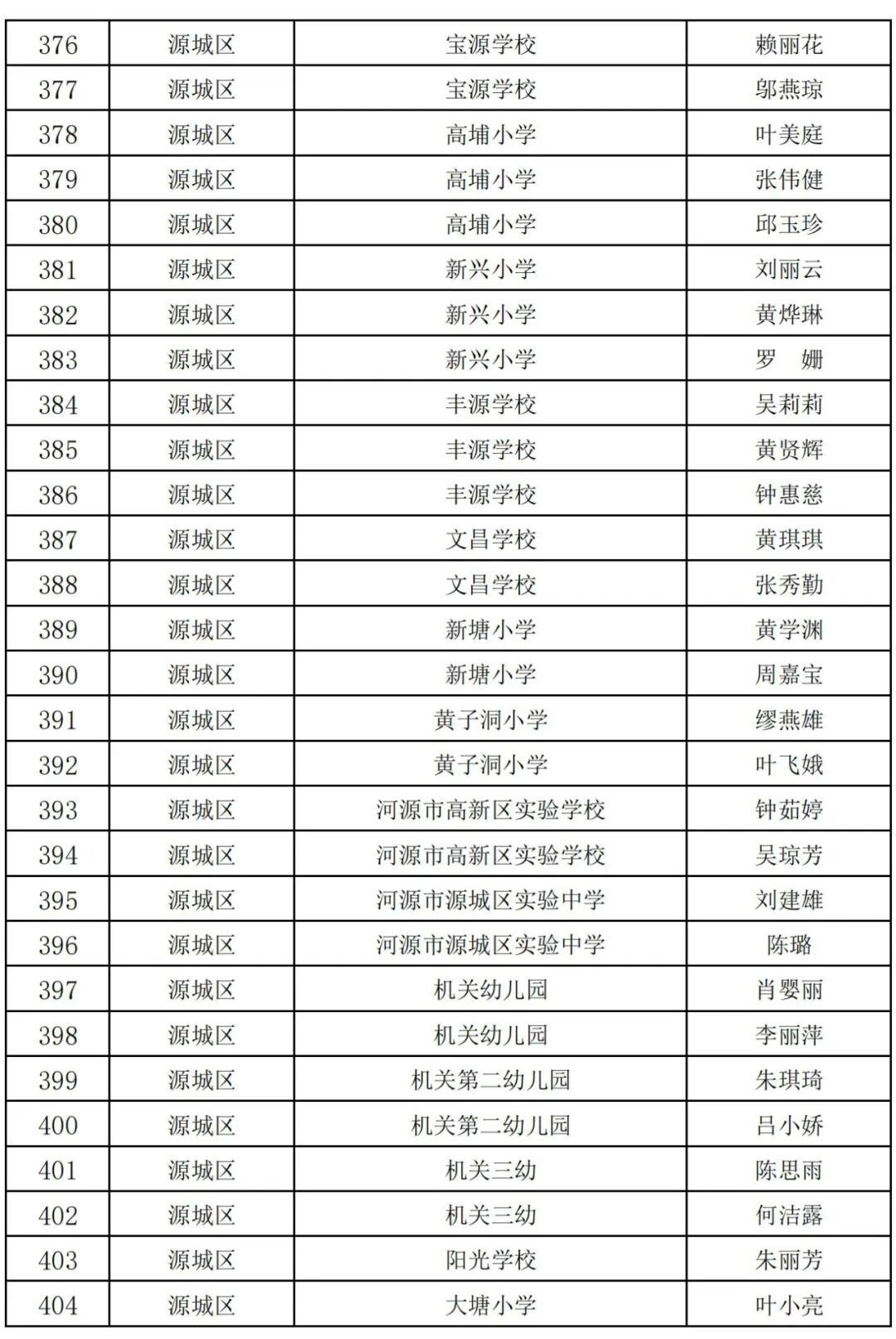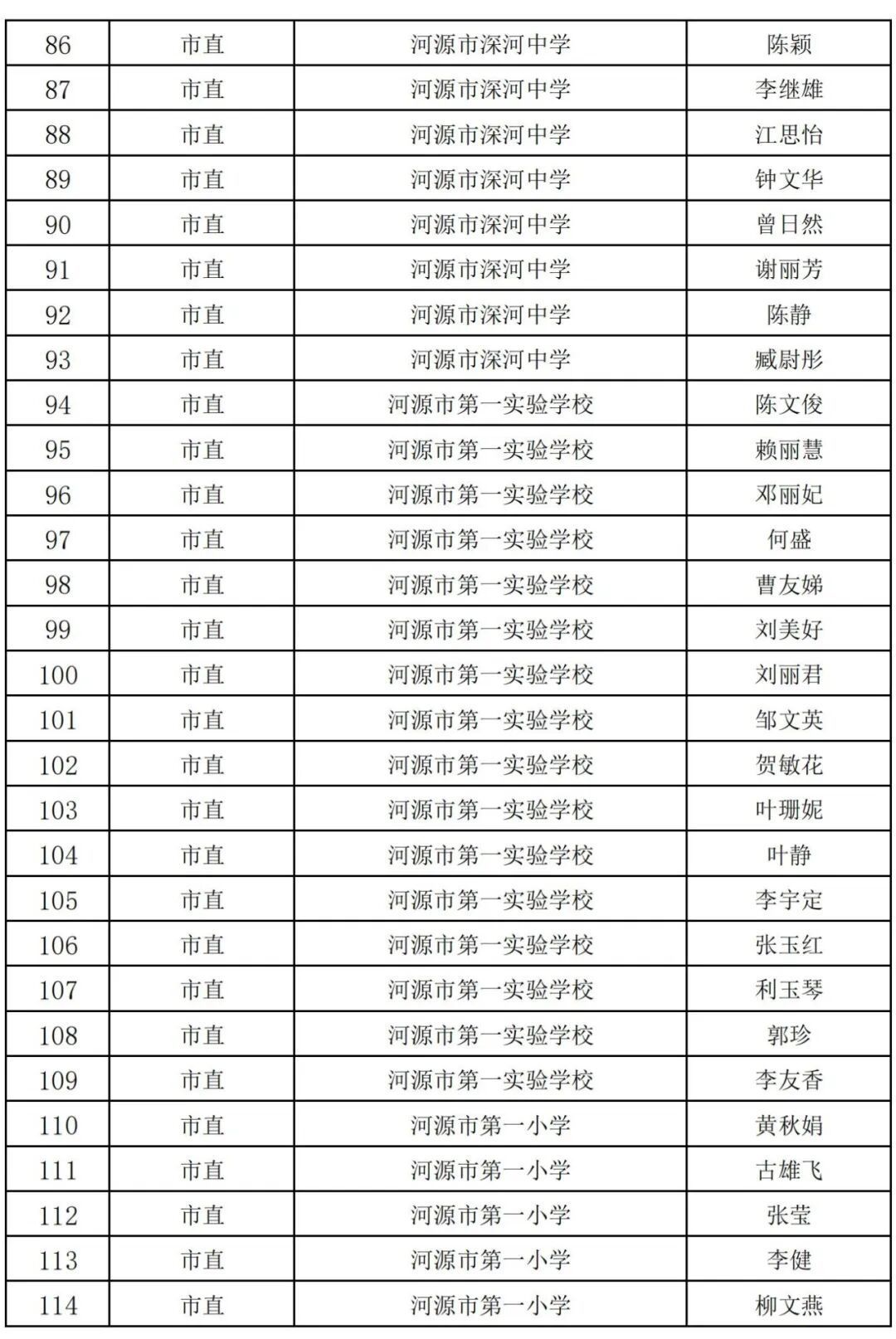 根据《河源市高素质教师队伍建设项目实施方案》《河源市教育局关于开展河源市中小学市级卓越教师、骨干教师(第二批)遴选认定的通知》(河教师〔2025〕23号),在各地各校推荐的基础上,经评审小组审核和遴选等环节,拟认定陈水燕等358人为市卓越教师,蔡健芳等1509人为市骨干教师,现予以公示(详见附件)。