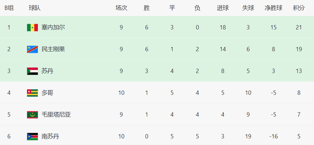 B组的塞内加尔9场21分、民主刚果9场19分,争夺1张直通世界杯的门票。对塞内加尔来说,主动权掌握在自己手上,只要击败毛里塔尼亚,塞内加尔就能拿到世界杯席位。